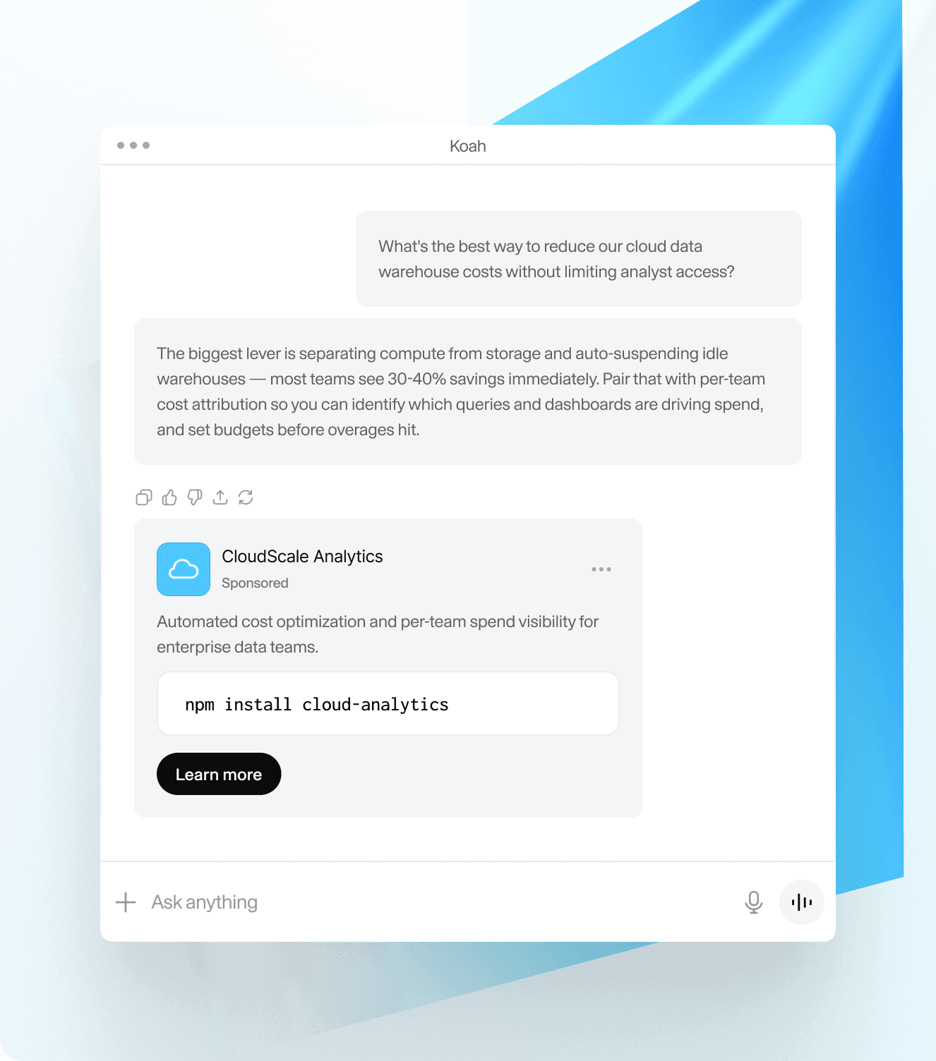 Most partners go live in minutes to a few hours. Koah provides a lightweight SDK for web, iOS, Android, and Flutter. After creating an account and adding your Publisher ID, you can place native ad units directly inside your AI chat or search interface. Our team supports initial setup to ensure placements are optimized for performance and user experience. For most AI apps, implementation requires minimal engineering resources and no complex infrastructure changes.