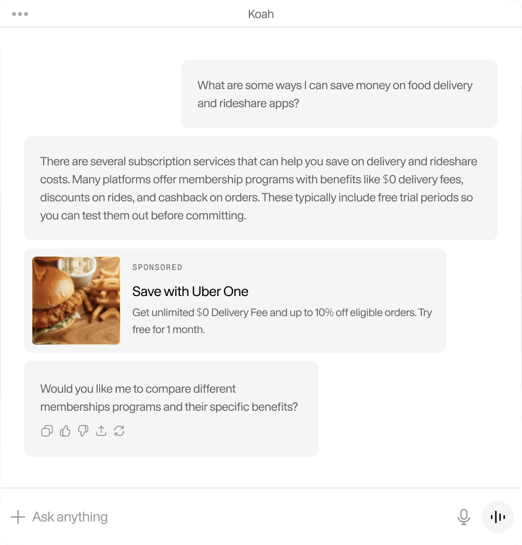 Native, context-aware advertising embedded directly inside AI chat. Designed to feel additive, not disruptive.