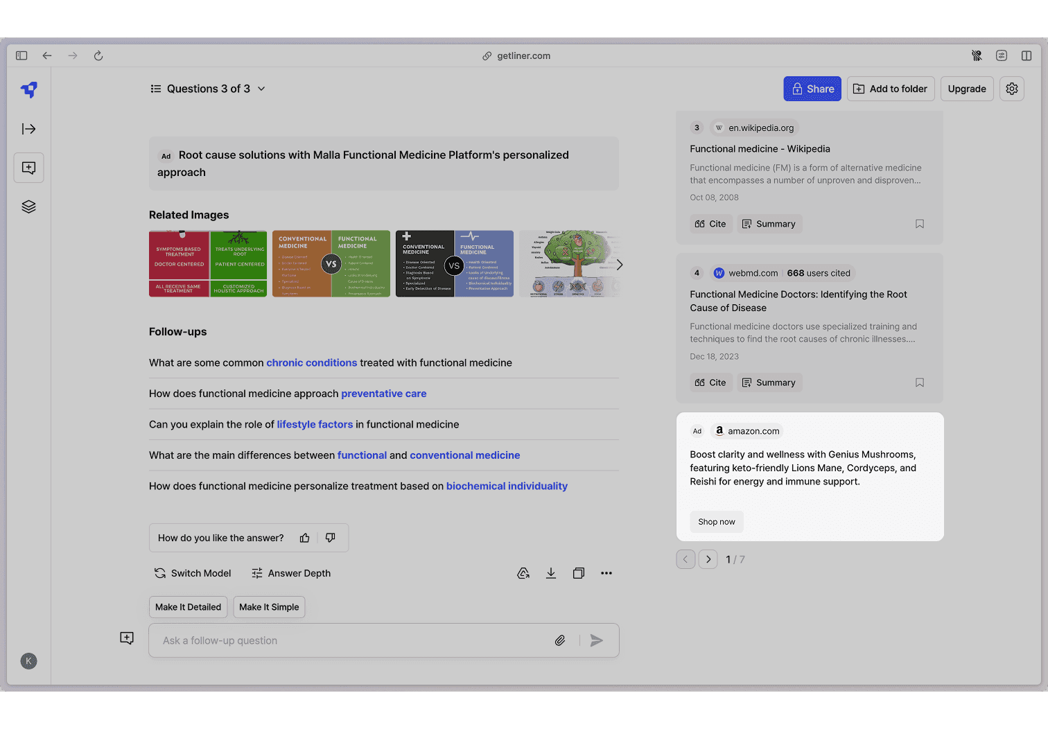 Picture this: A user reads an LLM-generated article on Liner, notices underlined text with source links, and discovers a relevant sponsored citation at the bottom. The high engagement—users actively scrolling and clicking—demonstrates the format's effectiveness.