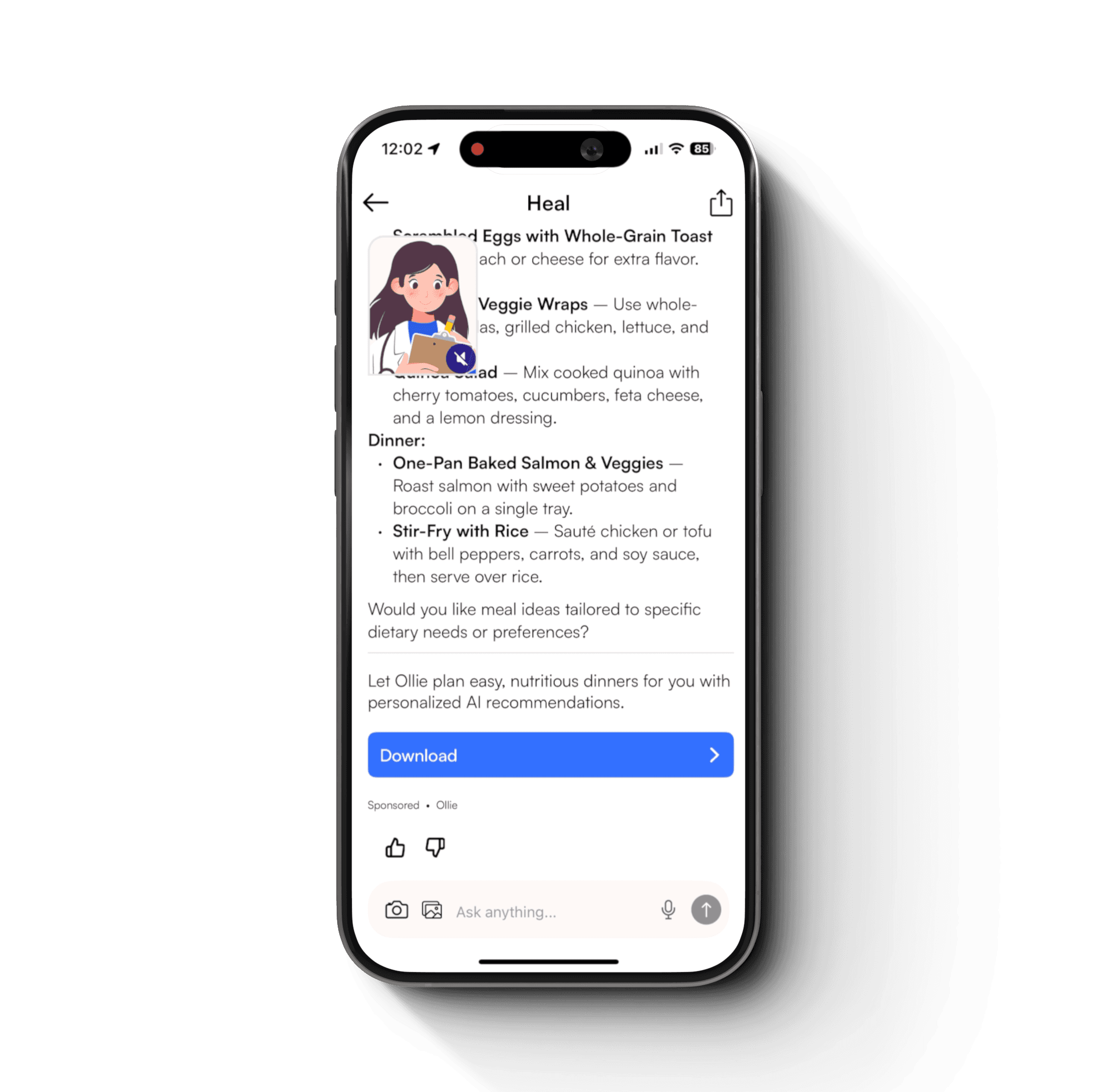 Let's start with suffix ads on mobile. These ads have proven to be exceptional performers, especially for our customer Heal. What exactly are suffix ads? They're ads that smoothly attach to the end of content generated by a large language model (LLM), featuring a flashing call-to-action (CTA) button that catches the eye while maintaining a seamless user experience.
