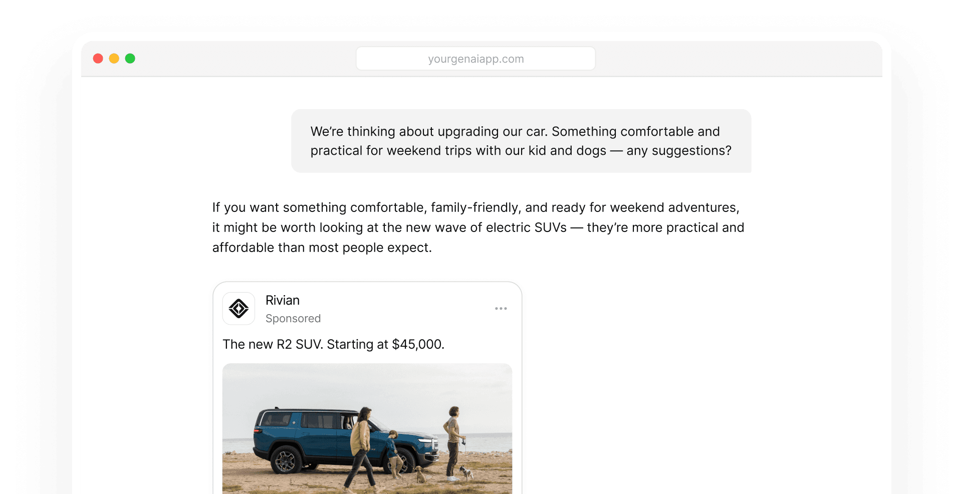 Yes. Publishers have control over advertiser categories and can apply brand safety preferences. Koah works with premium brands and ensures ads are aligned with your app’s audience and community standards. Because ads are served contextually within AI conversations, they are matched to relevant topics in real time — but you retain oversight over the types of advertisers that can appear in your experience.