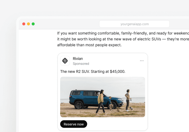Ads serve in milliseconds, so your AI app stays fast and responsive.